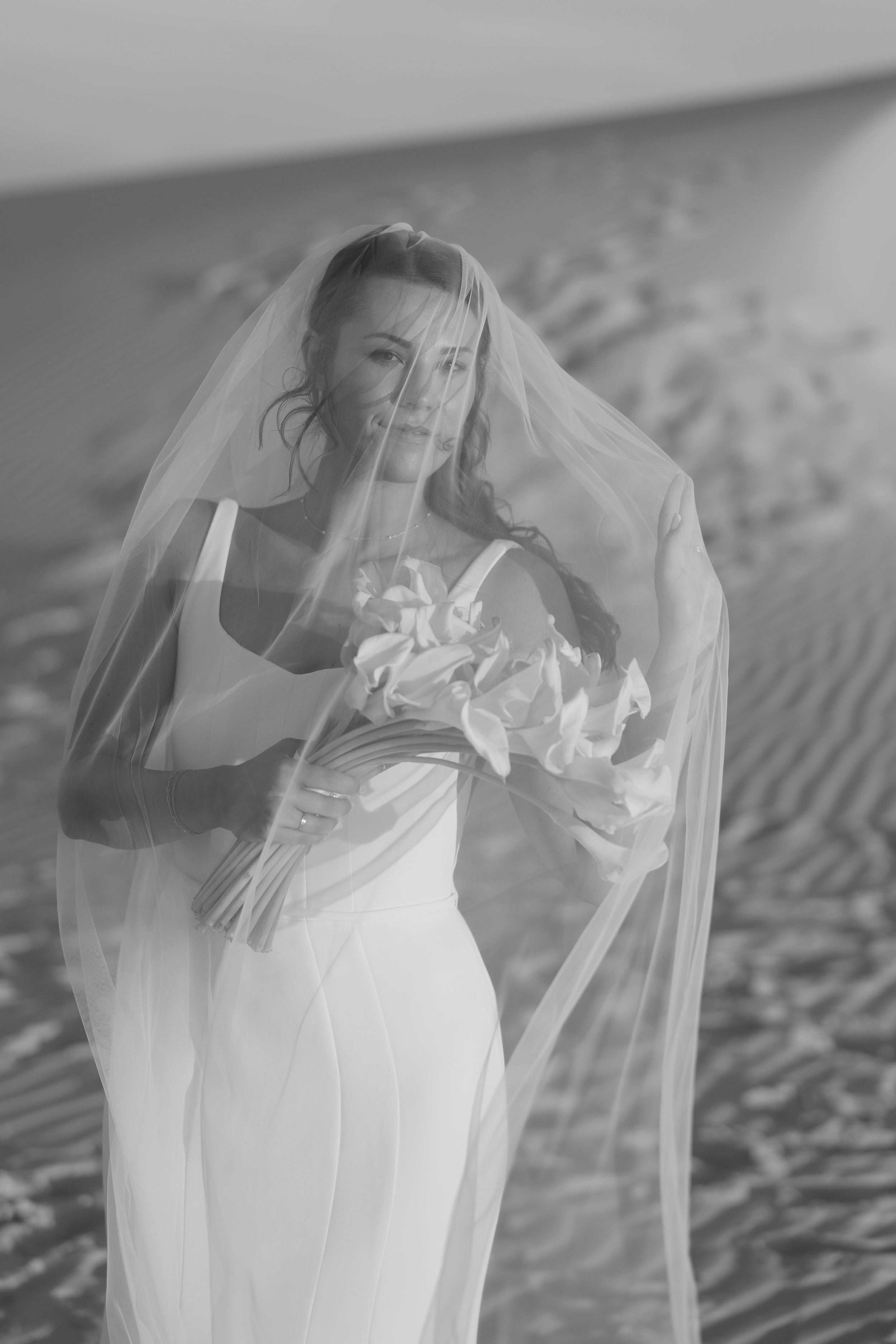 Forget traditional. For this West Texas session, we traded the garden for the dunes. Lizzie stunned with a sleek, cascading bouquet of blush calla lilies, a monochromatic choice that proves simplicity is the ultimate sophistication. It’s timeless elegance, reimagined for the modern bride.